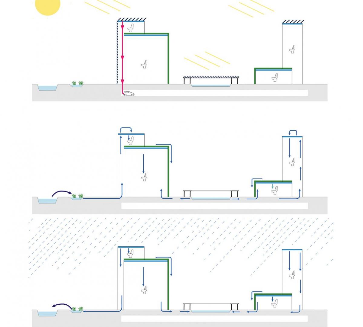 In het concept kunnen verschillende lagen worden onderscheiden. De verharding, waarover ook de auto’s rijden, kan worden gezien als één doorgaande plaat. Dit concept wordt versterkt door de verharding overal in dezelfde richting aan te brengen. Een volgende laag is het watersysteem. Het bestaat uit een netwerk van kanalen die zijn uitgesneden uit de verharding, de vijvers en de tuinen. Het watersysteem heeft één algemeen waterniveau. Naast het systeem van kanalen bestaat ook een laag van representatieve waterpleinen. Deze laag wordt gecombineerd met een groene lappendeken. Op een hoger niveau is er ook een laag van groene daktuinen en zonnepanelen. Het hoofdthema in dit concept is water dat voor een verticale verbinding zorgt tussen daken en kanaal. Daarom is water gekozen als belangrijkste ontwerpthema voor alle elementen; de vegetatie, de representatieve pleinen, als inspiratie voor de roosters over de kanalen, de wandelgang, de hal voor de entree en het landmark. Het eindresultaat is een interpretatie van duurzame ontwikkeling.